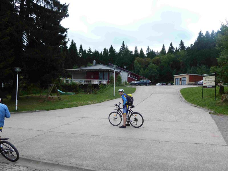 In der Pension „Am Rennsteig“ trafen sich dann alle am Samstagmorgen gegen 9 Uhr. André und Kerstin Schwarz fuhren Frank Thieme, Andreas Plos und Frank Kramer mit dem Auto nach Blankenstein. Dirk bekam als Ersatz Frank Kramers altes Mountainbike mitgebracht und Bernd stieg aufs Crossrad um. Bei bestem Wetter ging es zum Fotostopp zunächst kurz zurück zum Rennsteigbeginn und dann den Rennsteig entlang steil bergauf in Richtung Thüringer Wald. Auf einem ehemaligen innerdeutschen Platten-Grenzweg wurden wir in eine Sackgasse geführt. Mittag gab es im Waldgasthaus „Brand“. Interessant war die Werra-Quelle bei Masserberg. Unterwegs gab es gleich zwei Pannen (Bernd und Frank Thieme)! Nach ca. 100 Kilometern erreichten wir gegen 18 Uhr mehr oder weniger geschafft das Hotel „Am Bunker“ bei Allzunah/Frauenwald.